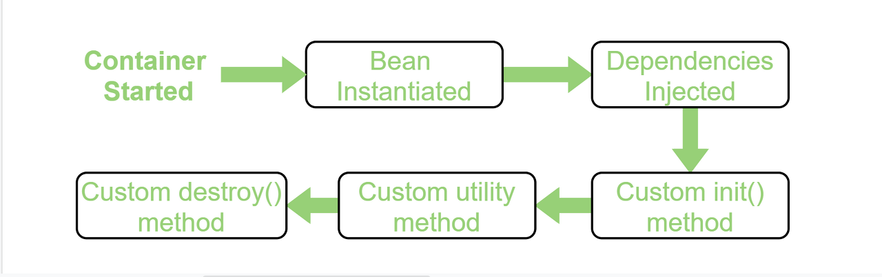 컨테이너가 초기화 될 때, Bean 객체를 설정 정보에 맞춰 생성하고, 의존 관계를 설정한 후, 해당 프로세스가 완료되는 Bean 객체가 지정한 메서드를 호출하여 초기화한다. Bean 객체를 사용한 뒤, 컨테이너가 종료되면 Bean 객체가 지정한 메서드를 호출하여 소멸된다.